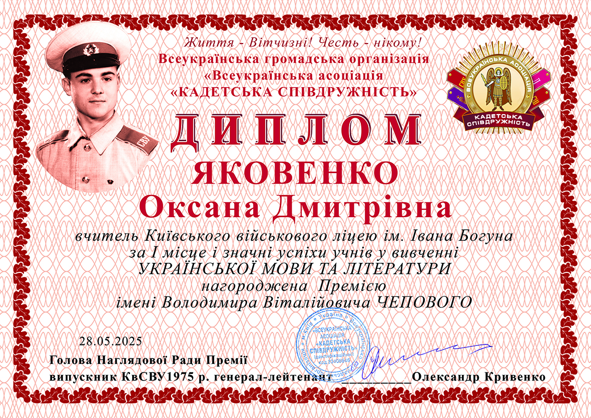 Літературна премія носить ім'я нашого побратима, київського суворовця 1994 року випуску, відомого українського письменника, видавця та медіа-бізнесмена Володимира Віталійовича ЧЕПОВОГО, що героїчно загинув, захищаючи Україну у 2022 році. Ми вдячні дружині Героя Тетяні за те, що вона разом з нами відвідує наш рідний освітній заклад, підтримує усе те, що так любив її чоловік, чому він присвятив усе своє життя. Сьогодні з рук пані Тетяни найкращі ліцеїсти та вчителі отримали іменні премії та ДИПЛОМИ.