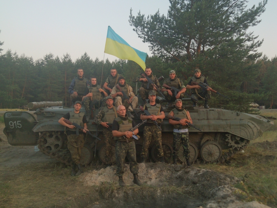 На світлині: Володимир Неженець (у центрі попереду) зі своїм підрозділом під час виконання бойового завдання в зоні АТО у 2014 році.