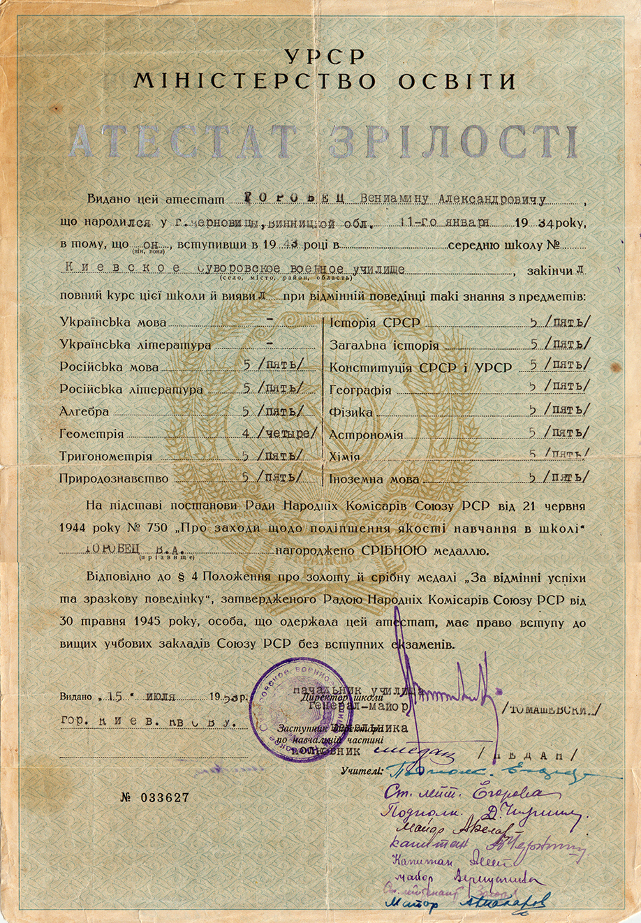 Веніамін Олександрович закінчив училище з "срібною" медаллю, потім навчався в Одеському Червонопрапорному піхотному училищі ім. Ворошилова.