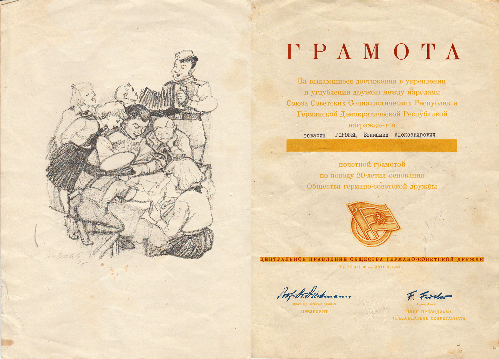 На світлинах: суворовець Веніамін Горобець, 1-й взвод 1-ї роти КвСВУ (командир взводу капітан Голинський Олександр Антонович), на роботі в училищному фруктовому саду, Атестат зрілості з позначкою про вручення "срібної" медалі, з бійцями під час служби в Німеччині, грамота Веніаміну Горобцю від Товариства німецько-радянської дружби, начальник КВЛ ім. Івана Богуна генерал-майор Леонід Кравчук вручає ветерану-випускнику Веніаміну Горобцю почесну грамоту за активну участь у вихованні ліцеїстів (2007 рік).